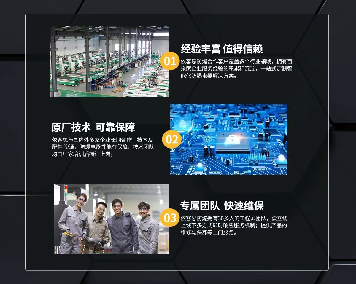 依客思防爆專注于防爆產(chǎn)品的研發(fā)、生產(chǎn)與銷售,主要產(chǎn)品有:防爆操作柱、BXCQ防爆靜電釋放儀、BZC系列防爆操作柱、不銹鋼現(xiàn)場操作箱、BXM(D)防爆照明(動力)配電箱、BXX防爆檢修箱、BXJ防爆接線箱、LED防爆燈、防爆管件、防爆風(fēng)機(jī)等產(chǎn)品,型號規(guī)格齊全,廣泛適用于煤炭、電力、醫(yī)藥、石油、化工、航空等領(lǐng)域。我公司產(chǎn)品質(zhì)量過硬,價(jià)格實(shí)惠,銷售范圍廣,且與各大型企業(yè)建立了良好的合作關(guān)系,同時(shí)還遠(yuǎn)銷中、東亞和北美等地區(qū),深受用戶喜愛與青睞。