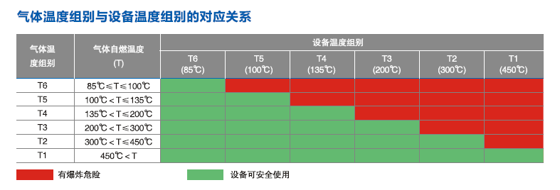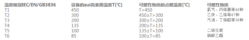 爆炸性氣體混合物的引燃溫度是能被點(diǎn)燃的溫度值。防爆照明設(shè)備按其zui高表面溫度分為T1~T6組,使得對應(yīng)的T1~T6組的防爆照明設(shè)備的zui高表面溫度不能超過對應(yīng)的溫度組別的允許值。溫度組別、設(shè)備表面溫度和可燃性氣體或蒸氣的引燃溫度之間的關(guān)系如圖所示。