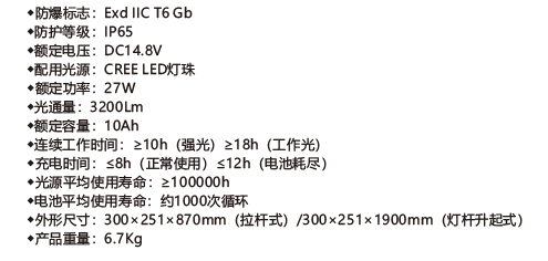 適用于鐵路、電力、船舶、石油、化工、施工等各種易燃易爆場(chǎng)所現(xiàn)場(chǎng)作業(yè)、事故搶修大范圍照明及工作現(xiàn)場(chǎng)提供移動(dòng)照明