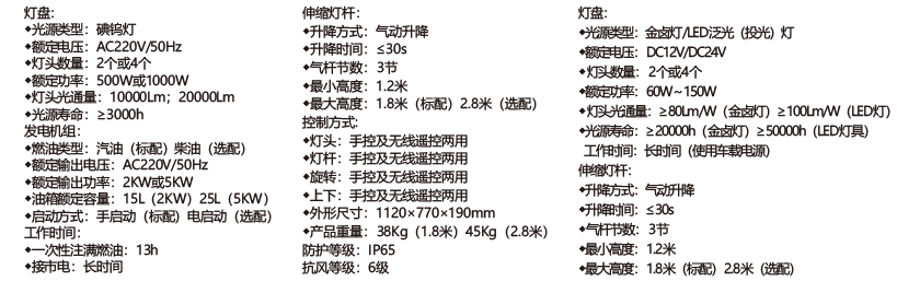 如本產(chǎn)品的標(biāo)準(zhǔn)配置不能滿足客戶的工作需要,我司可在燈頭燈泡功率、泛光或聚光類型、伸縮氣的升起高度及其它配備上按客戶要求做出調(diào)整,以滿足客戶的個(gè)性化需求