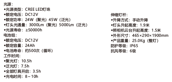 3. 可直接使用電池供電,所有燈亮<35h,聚光燈亮<10.5h,泛光燈亮<75h;并配有車載電源線,電量不足時(shí)可采用車載電瓶進(jìn)行供電
